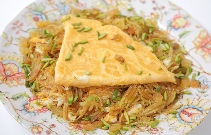 8ضعي الشعيرية في طبق تقديم، ضعي فوقه البيض الاومليت، زيني بالمزيد من الزبيب والفستق حلبي وقدميه مباشرة.