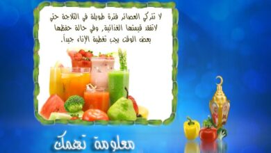 عصائر مفيدة لاتتركي العصائر فترة طويلة في الثلاجة حتي لا تفقد قيمتها الغذائية، وفي حالة حفظها بعض الوقت يجب تغطية…