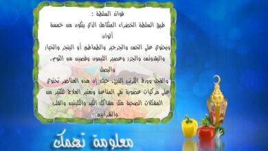 طبق السلطة الخضراء المتكامل الذي يتكون من خمسة ألوان ويحتوي علي الخس والجرجير والطماطم أو البنجر والخيار والبقدونس والجزر وعصير…