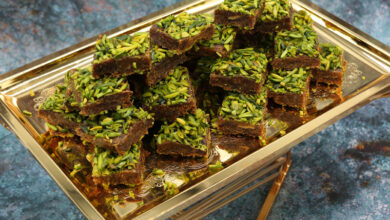 مقادير الوصفة طريقة التحضير 1احضري صينية متوسطة الحجم. 2بعض نصف كمية الفستق في القاع.3في قدر سخني الزبدة، أضيفي التمر، اضيفي…