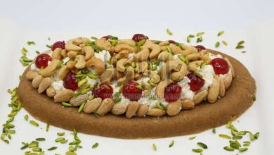 مقادير الوصفة طريقة التحضير 1العجينة: في وعاء الخلاط ضعي السميد، الدقيق، السكر، البيكنج باودر، المستكة. ثبتي مضرب التقليب وشغلي لعدة…