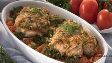 مقادير الوصفة طريقة التحضير 1يثبت الرف الشبكي الأوسط في الفرن، الذي يسخّن على حرارة 180 درجة مئوية.ويحضّر طبق فرن مناسب،…