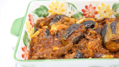 مقادير الوصفة طريقة التحضير 1 قشري الباذنجان على شكل خطوط ( ذلك يحافظ على الباذنجان أثناء الطهي) اعملي شق صغير…