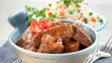 مقادير الوصفة طريقة التحضير 1أحضري قدر متوسط الحجم ضعي الزيت .أضيفي اللحم قلبي إلى أن يجف .أضيفي الملح .الفلفل .دعي…