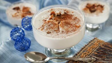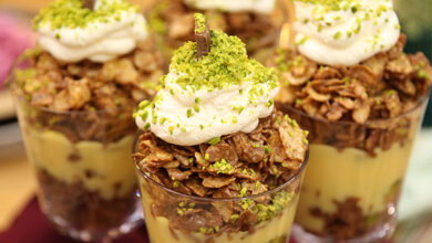 مقادير الوصفة طريقة التحضير 1 احضري كاسات شفافة.2 صلصة الكراميل: في مقلاة ضعي السكر، سخني على نار هادئة ليحترق السكر…