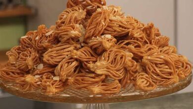 مقادير الوصفة طريقة التحضير 1 في وعاء الخلاط ضعي السميد، الدقيق، البيكنج باودر، الملح، السمسم، القيمر وماء الزهر، ثبتي مضرب…