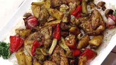 مقادير الوصفة طريقة التحضير 1 أحضري طبق فرن كبير الحجم. 2 باستعمال سكين حادة قطعي الدجاجة إلى ٨ قطع أو…