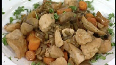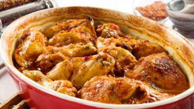 مقادير الوصفة طريقة التحضير 1 سخني الفرن 180م، احضري طبق فرن متوسط الحجم. 2 قطعي الدجاج الى ثمانية قطع. 3…