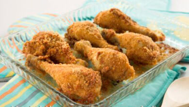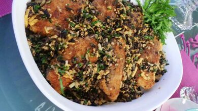 مقادير الوصفة طريقة التحضير 1 قطعي الدجاج الى اربعة قطع 2 في طبق ضعي الملح، الفلفل والبهار، وزعي نصف كمية…
