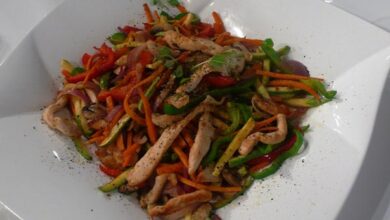 مقادير الوصفة طريقة التحضير 1 في مقلاة واسعة ضعي الزيت. ضعي المقلاة على نار قوية ثم أضيفي شرائح الدجاج. قلبي…