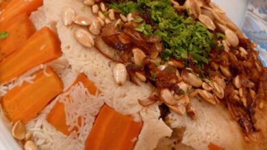مقادير الوصفة طريقة التحضير 1 إغسلي الأرز عدة مرات ثم انقعيه لمدة ٣٠ دقيقة. 2 خليط الدجاج: في طبق واسع…