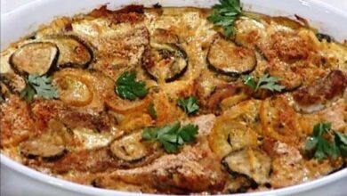 مقادير الوصفة طريقة التحضير 1 سخني الفرن إلى درجة حرارة ١٨٠م. أحضري طبق فرن واسع مناسب للتقديم على المائدة. 2…
