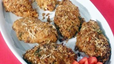 مقادير الوصفة طريقة التحضير 1 اطرقي الدجاج الى ان يصبح رقيق جدا. 2 انثري فوقه الملح، الفلفل والهيل. 3 اشويه…