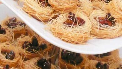 مقادير الوصفة طريقة التحضير 1 العجينة: في ابريق الخلاط ضعي الدقيق، السميد، البيكنج باودر والماء، شغلي على سرعة متوسطة إلى…